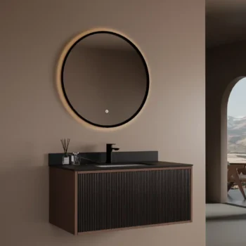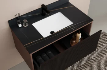 Bergamo Amsterdam Vanity Wall Mount Bathroom Cabinet with Integrated Sink – Dark Walnut & Matte Black Top