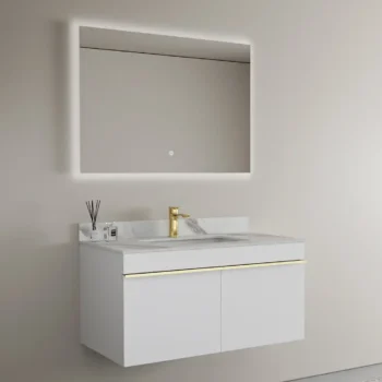 Bergamo Beijing Vanity Wall Mount Bathroom Cabinet with Sink – Gloss White & Gold Accent