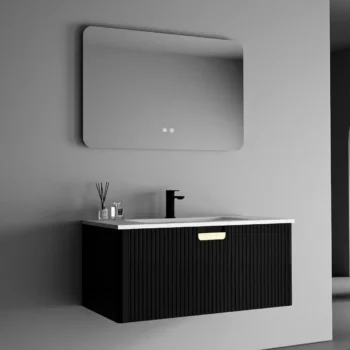 Bergamo Paris Vanity Wall Mount Bathroom Cabinet with Integrated Sink – Matte Black & Gold Handle Accent