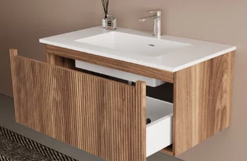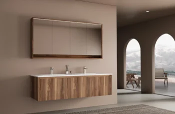 Bergamo Milan Vanity Wall Mount Double Bathroom Cabinet with Integrated Sink – Natural Walnut & White Countertop