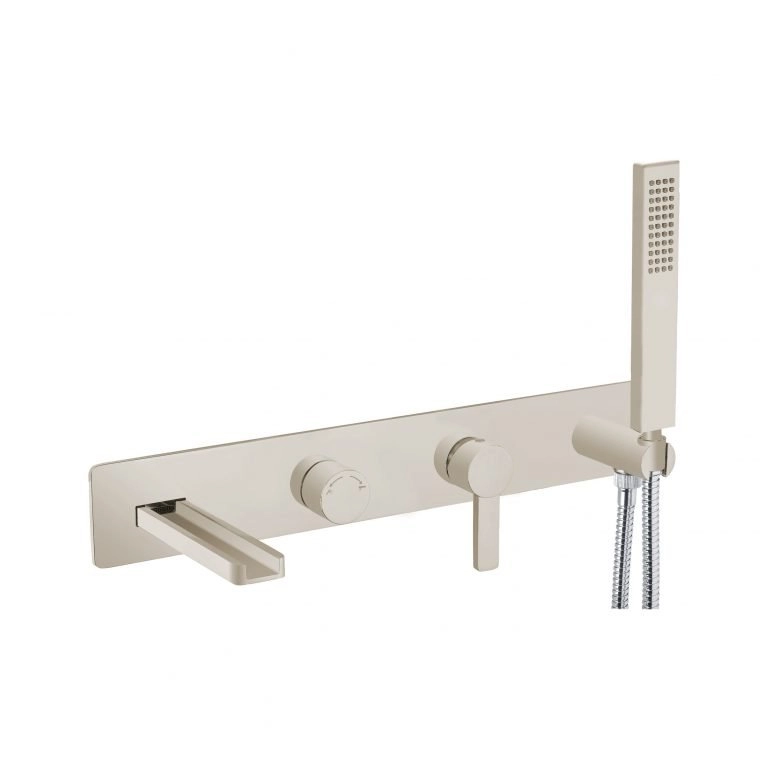 The DISEGNO Aqua 700016 is a stunning and functional wall-mounted tub filler that brings a sophisticated, clean look to your bathroom. This elegant fixture features a sleek, minimalist design with separate controls for water flow and temperature, ensuring precise and easy operation. It includes a convenient, integrated handheld shower for added functionality. Crafted with a durable, polished chrome finish, this faucet provides a luxurious and space-saving solution for modern bathrooms, making a bold statement without cluttering the deck of your tub.