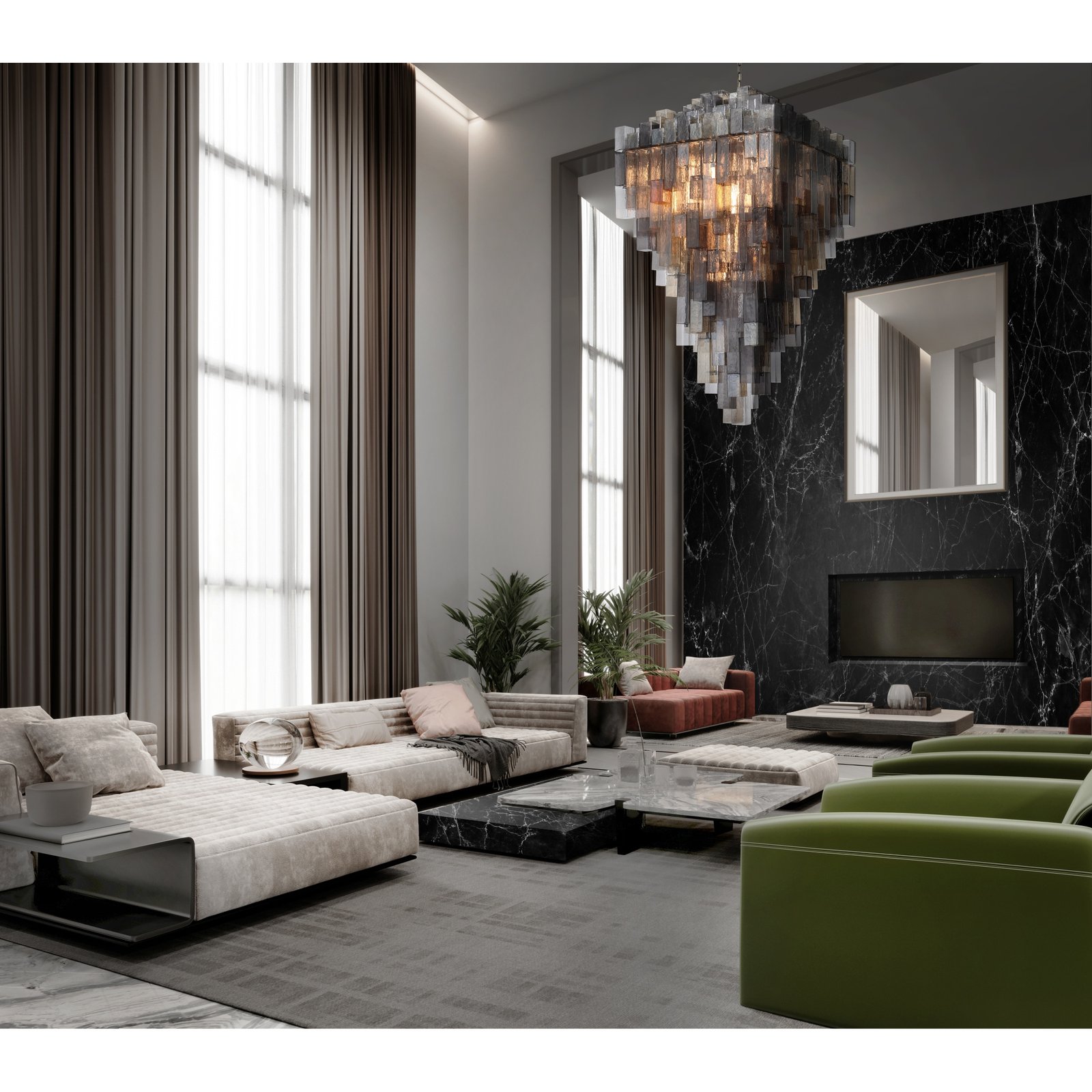 A series of stepped square balusters are the backbone of a staircase; adding grace and strength to a functional element in a building. Using this same tiered visual, Altesa dresses square frames with elongated square tubes of glass. The varying lengths, tones and densities of glass influence the depth and color of light, presenting a mesmerizing display in grand proportions.