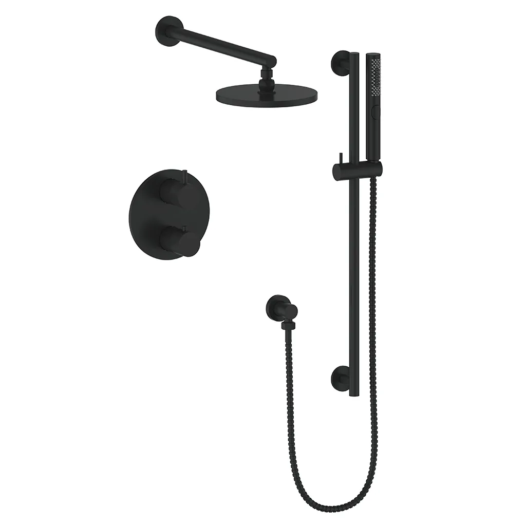- Includes hand shower with hose and overhead shower with 6″ ceiling arm