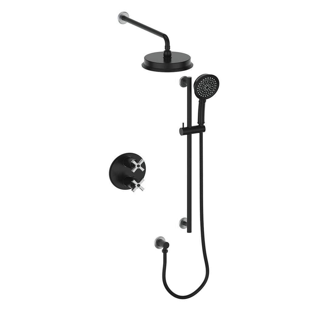 Perfect for high-end bathroom projects seeking the drama of a matte black finish, the modernity of X-handle design, and the flexibility of dual showering functions.